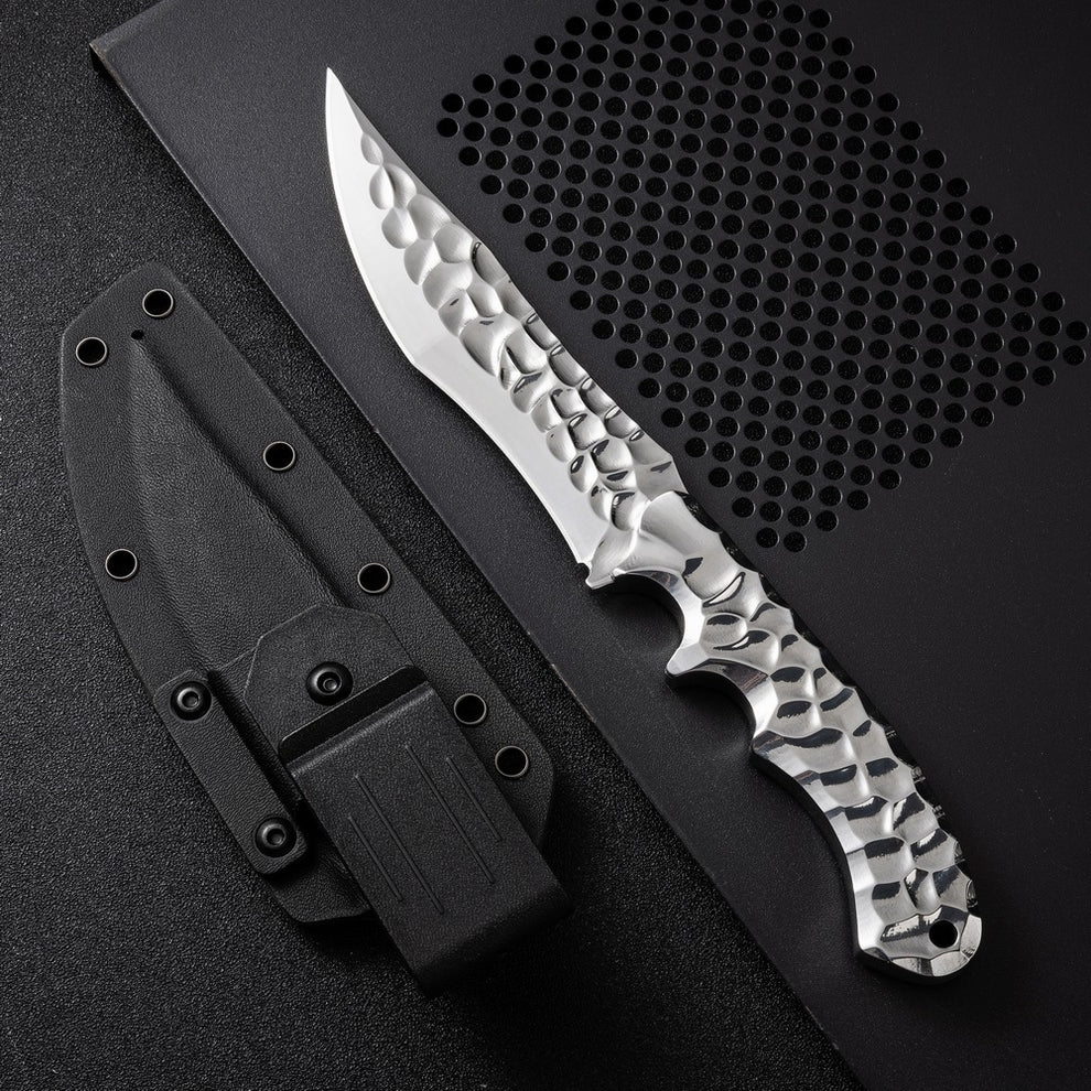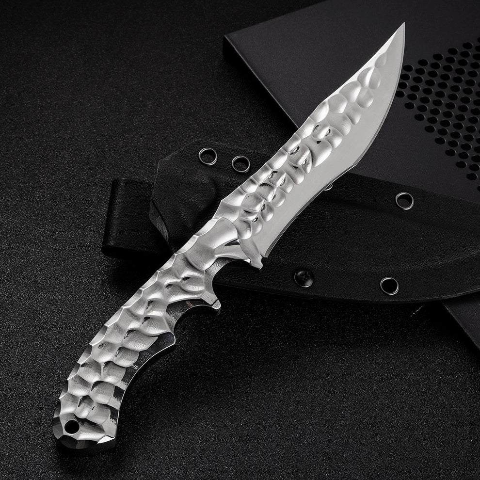The one-piece cast design ensures the blade is strong, stable, and impact-resistant, while the forged texture and ergonomic handle provide a comfortable grip for outdoor use. The silver blade shines elegantly in the snow, making the knife both a practical tool and a stunning piece of art for winter adventures and survival scenarios.