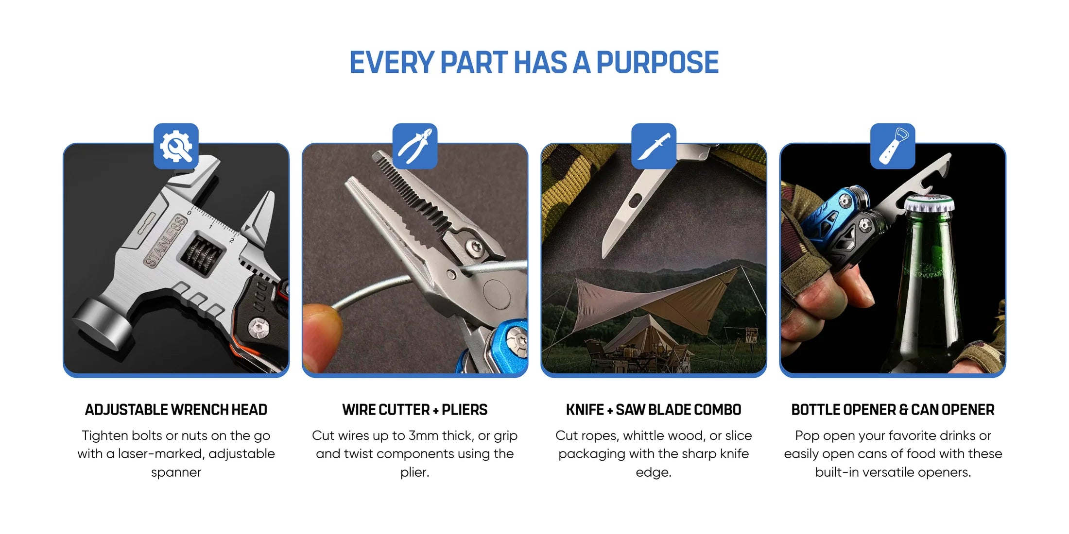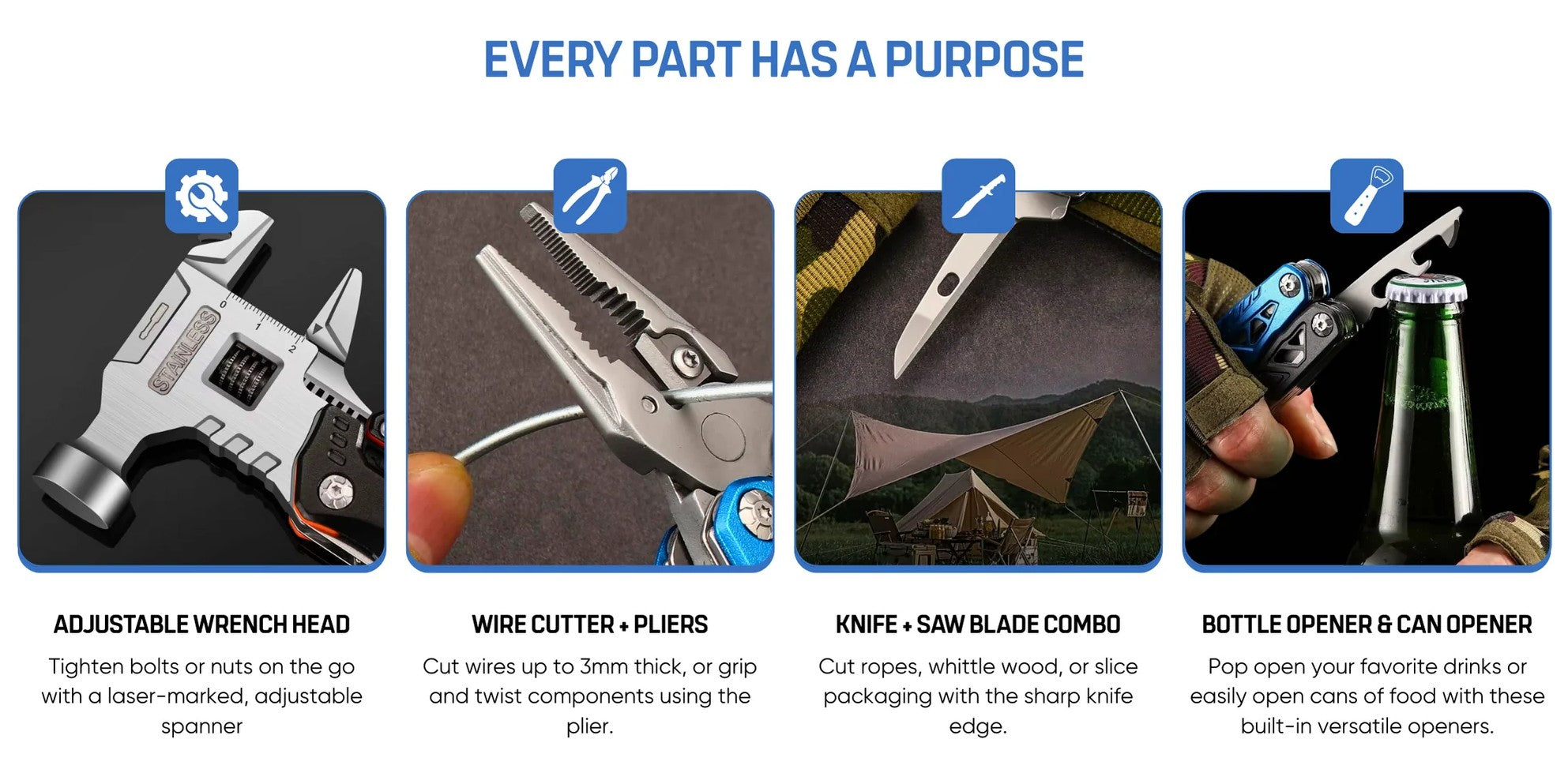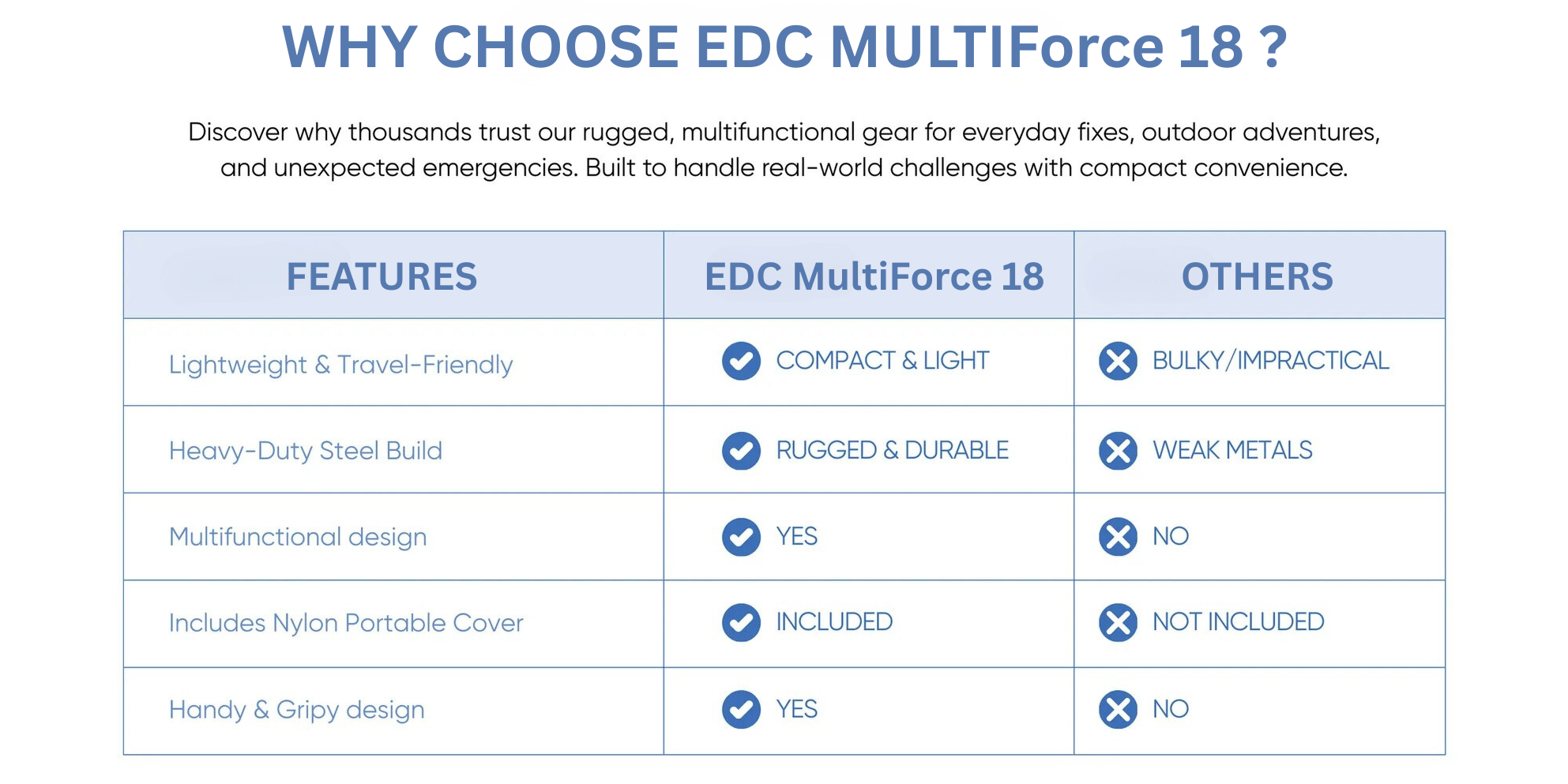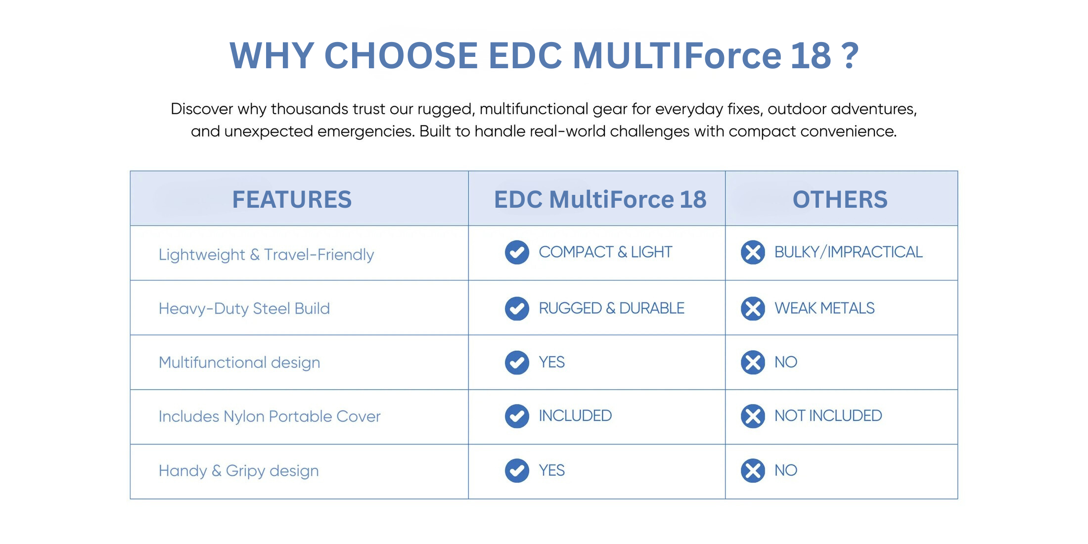 Imagine holding an entire toolbox in one hand. With 18 essential functions, including an adjustable wrench, precision pliers, wire cutters, hammer, and blade — the EDC MultiForce 18 delivers everything you need in one compact design. It saves space, reduces clutter, and keeps you ready for any task, anytime. All the tools you need — none of the bulk.