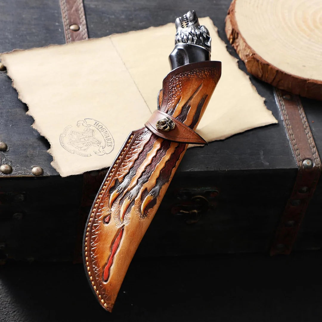 Its ebony wood and stainless steel handle with a wolf head design blends toughness with elegance. Complete with an Italian handcrafted leather sheath and gift box, this blade is built like a survival knife, refined like a chef’s knife, and crafted to last a lifetime.