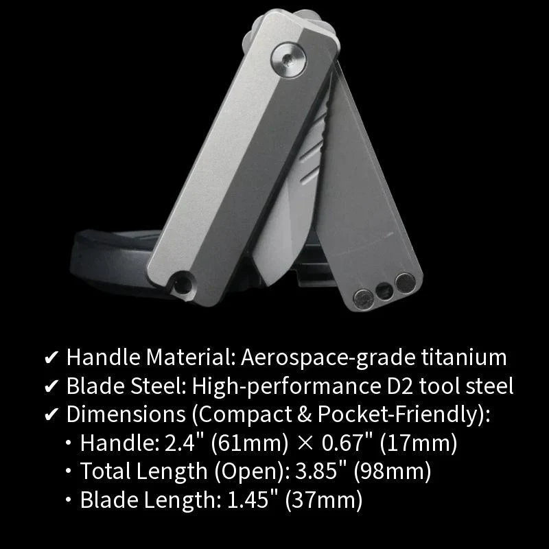 - Material: Grade 5 Titanium handle // D2 Tool Steel blade (HRC 60-62)